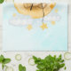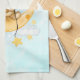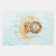 Kitchen towel with a cute watercolor illustration. An adorable lion wearing a crown fishing for stars sitting on a crescent moon resting on a fluffy cloud. Magical fantasy illustration. Light blue watercolor background.