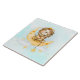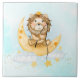 Ceramic tile with a cute watercolor illustration. An adorable lion wearing a crown fishing for stars sitting on a crescent moon resting on a fluffy cloud. A bunch of faux gold foil stars by the clouds give this design a magical feel. Light blue watercolor background.