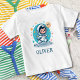 Personalised baby shirt with a cute little astronaut kid on the moon with a smiling planet and stars.