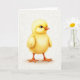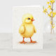 This card features a small yellow baby bird centered on a pale, lightly textured background, with tiny feather tips drawn one by one to look soft and downy. Its round head and glossy black eyes catch a pinpoint highlight, giving it a gentle, attentive gaze that feels like a quiet hello between close friends. A small orange beak and matching three-toed feet add a warm contrast, as if the little bird has just stepped forward to be near you. Soft, diffused lighting creates a faint shadow under its body, keeping the scene calm and grounded. Near the top, simple Easter text in a light gray tone sits neatly spaced above the illustration, leaving plenty of breathing room. A second line of smaller text appears near the bottom in the same soft color, balanced to frame the bird without crowding it, and a small 🌷 detail sits nearby. The background shows subtle diagonal lines running across the page behind the bird 🐰.