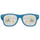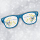 These retro party glasses have cute little red and blue birds sitting on branches with bright yellow flowers on a white background. Customise your text with the template.