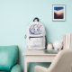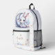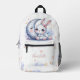 Super cute kids backpack featuring cute white little bunny wearing a beautiful pink bow sitting in front of the silver crescent moon with some gold falling stars.