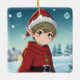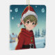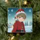 Cute adorable little elf sitting outside on a winter day. personalised Christmas ornament for a boy.