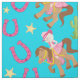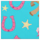 This cute, western theme, pattern features an adorable, little cowgirl on her pony, pink horse shoes, green cactus, and yellow star badges.