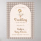 cute and adorable farmhouse little duckling baby shower theme, design feature muted and neutral brown beige watercolor whimsical duck wearing hat on the ivory boho arch and neutral brown gingham background. you can customised your own word via " personalised this templete".
