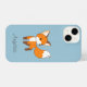 Cute little fox with large ears is standing with his bushy tail up and looking to the side.