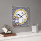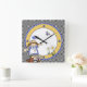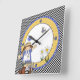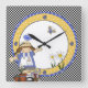 Whimsical wall clock of a cute little girl gardener, with a little blue bird on her head. A black and white checkerboard frame around the outside of the clock, with a colorful blue, white, and yellow circular middle decorated with polka dots, flowers, and a butterfly, with blue and yellow ladybugs in place of the hours 12, 3, 6, and 9 o'clock. Customize to add text to this colorful fun clock great for any room of the house.