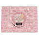 New baby or baby shower gift bag in pink featuring a sweet little baby girl in a pink buggy on a background of text detail with the words cute baby love etc. gift bags from Ricaso