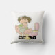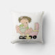 A cute pillow for your little girl's room, featuring a cartoon little girl holding her dolly which she's about to place in her doll's buggy or pram. The colours are pink, yellow and a pastel green…the image is only on one side of the cushion, the background colour is white. Another version available with the design on only side. If you choose the smaller cushion, you can make the image smaller.