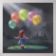 A cute little girl wearing a pink shirt and blue skirt stands holding five colourful balloons. She is bringing a patch of brightness to a dark world. In the distance is a grey building surrounded by mist and dark trees and mountains.