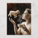 A woman having tea and then a cute mini lamb magically appears floating in the air in a vintage style of photography.