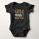 Cute "Little Miss New Year" typography in gold and white with exploded fireworks display.