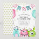 Your little monster is turning one! Celebrate in style with these very cute and sweet monster themed party invitations. The invitation can be personalised to include your little one's party details! This super cute and easily personalised birthday party invitation has been designed with a first birthday in mind however the birthday age can be edited so whatever the age of your little monster, this birthday invitation can be edited to suit any birthday age.