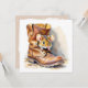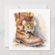 A cute little watercolor illustration with a mouse peeking out from an old brown boot. Blank card.