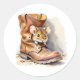 A cute little watercolor illustration with a mouse peeking out from an old brown boot.