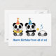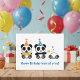 Three adorable little pandas in birthday hats sitting beside each other. One happy panda is wearing a tee shirt with "I heart panda" written on it. Another is offering a candy to a third panda that has fallen asleep.