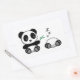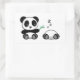 A pair of cute cartoon pandas. The left panda is holding a bamboo stick watching the right panda who has fallen asleep.