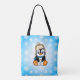 A cute little baby penguin in a winter cap with snowballs and a blue snowflake background Christmas Gift bag. Instead of a stocking you can only use once a year, get a tote bag they can use throughout the year!
