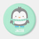 A magnet with a cute little penguin with a green stripes winter scarf and a pair of blue ice skates. Mint background colour can be changed. Great as a mini gift or Christmas stocking fillers! Personalise with child's name.
