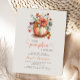 This cute baby shower invitation features a watercolor pumpkin overflowing with fall flowers and foliage above the words "a little pumpkin is on the way," with the word "pumpkin" in orange handwriting script decorated with curlicues in imitation of pumpkin vines. Personalise the text with the name of the mum-to-be in orange script and the details in charcoal grey sans serif font on a beige background. Ideal for a gender-neutral fall baby shower.