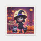 This Napkins features a cute little witch in a black costume with cats and pumpkins on Halloween night.