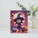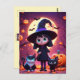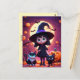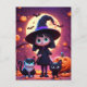 This postcard features a cute little witch in a black costume with cats and pumpkins on Halloween night.