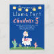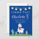 Have a fiesta with this whole llama fun birthday party invitation. This design features a string of star-shaped party lights with a dark blue background with cactus and a llama decorated with a crown and flowers.