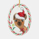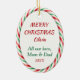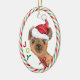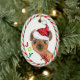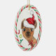 On the front of this cute Christmas ornament, a little brown baby llama wears a red and white Santa hat and a red bow. At one side is the colorful text that says "JOY". A red and green candy stripe border finishes the design. The back of the ornament has the same border, and four text fields in red and green for you to customize.