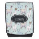 Personalised backpack with a cute pattern featuring whimsical llamas. One is laying down, one is holding a flower in his mouth, and one is looking at you suspiciously. These animals have lots of charming character. Set on a green polka dot background. Layered over top is a vintage fancy frame in black and white with your text inside.