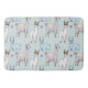 Bath mat with a cute pattern featuring whimsical llamas. One is laying down, one is holding a flower in his mouth, and one is looking at you suspiciously. These animals have lots of charming character. Set on a green polka dot background.