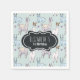 Birthday paper napkins with a cute pattern featuring whimsical llamas. One is laying down, one is holding a flower in his mouth, and one is looking at you suspiciously. These animals have lots of charming character. Set on a green polka dot background. Layered over top is a fancy frame with your personalised text inside.