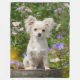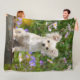 A young long-haired cream white coloured Chihuahua dog sitting in a flowering garden, photo taken by Katho Menden. This soft fleece blanket is a gift idea for dog lovers.