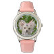 A young long-haired  cream white coloured Chihuahua dog sitting in a flowering garden, photo taken by Katho Menden. This girls wrist watch with dial-plate is a gift idea for dog lovers.