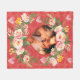 Floral garlands, hearts, and a heart-shaped photo on a red background, perfect for loved ones, marriages, and couples. Romantic Heart-Shaped Photo Blanket!