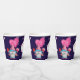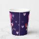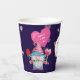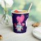 These are fun Valentine's Day party paper cups that can easily be adapted to other celebrations, such as engagement parties.They feature a funny white bearded little gnome dressed in blue and pink, and holding a red rose and a pink heart. Above the gnome is a large pink heart that says "Love is in the air". The image is printed on two sides, with a circle banner between them that holds your custom text. Everything is placed on a navy blue background with scattered lavender and light pink hearts.