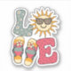Cute vintage laptop sticker with text, "Love" along with a smiling summer sun wearing leopard print sunglasses, and beach flip flops decorated with flowers and retro stripes