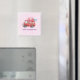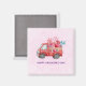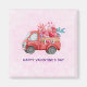A happy valentine's day magnet with a cute red watercolor truck. Carrying hearts and flowers in the back. I love u, written on the side. Whimsical and adorable. Light pink patterned background.