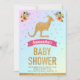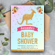 Amaze your guests with this beautiful kangaroo theme baby shower invitation featuring modern typography on a pastel rainbow gradient background. Simply add your event details on this easy-to-use template to make it a one-of-a-kind invitation. Flip the card over to reveal a faux gold glitter stripes pattern on the back of the card.