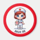This magnet for nurses features a cute brunette Manga nurse with red hair and blue eyes wearing a nurses cap and outfit with a name to personalise and a red border. Perfect for a nurse or nursing school graduate. Image generated with AI.