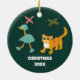 This personalised Christmas ornament has illustration of a dog and a goat marionette puppet on the front and a bird and a cat marionette puppet on the back. There's a spot to add a name on the front and a spot to add an additional message on the back.