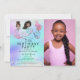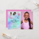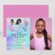 Girl's mermaid birthday invitation with a custom photo for any age. Kids' birthday party invite with black-haired mermaids and a watercolor design with faux glitter on the background. Change the pink backing colour by clicking the button to edit the design.