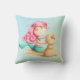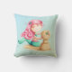 Beautiful and unique mermaid pillow. The illustration is a mermaid with pink hair playing with the sand and making a "sandman". The soft colours of blue and pink, along with the warm brown, make it perfect for little kids. Illustrated by Patricia Alvarez.