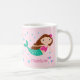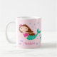 This mug features a cute whimsical mermaid under the sea design with fish, turtle, seahorse and starfish on a pastel pink background. Personalise it with a name.