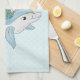 Kitchen towel with an adorable illustration. Designed with a pretty mermaid girl riding a happy dolphin. A little jellyfish friend accompanies them. Decorated with little splatters of faux gold glitter. Light blue background with faded pink polka dots.