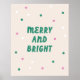 Decorate your home with this cute and fun holiday poster in pink and green, surrounded by confetti dots and "merry and bright" in a cute handwritten font. Here shown in pink and Kelly green, but you can change the colours to any colour you wish.