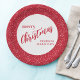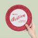 This design features a Christmas holiday calligraphy script paper plate with a merry Christmas cute typography, a simple minimalist minimal, cute simple calligraphy script, stylish trendy typography lettering, stylish trendy classic classy timeless, festive minimalist minimal traditional, festive holiday red and white, a creative simplistic elegant elegance, holiday party disposable paper supplies