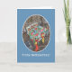 A Christmas Card with the greeting in German, 'Frohe Weihnachten' and three cute little wood-mice tucked up under their patchwork quilt, waiting to discover what's in their Christmas Stockings that are hung from the foot of their bed. From a whimsical illustration, hand-painted in watercolour and ink by Judy Adamson and digitally enhanced.