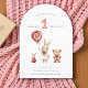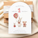 Celebrate your little one's special day with this adorable 'Hop along and celebrate' themed invitation. Featuring charming watercolor illustrations of a bunny rabbit, teddy bear, and a smaller bunny, this design is perfect for a whimsical first birthday party. The playful red and white gingham accents and a sweet apple balloon add a festive touch, making it a memorable way to invite guests to your baby's milestone celebration. This invitation is sure to delight both children and adults alike.