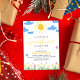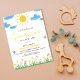 A beautiful illustration of Sun and garden with flowers and butterflies and a beautiful blue sky are the element that make this a cute gender neutral baby shower invite.