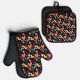 Explore a sleek, modern oven mitt and pot holder set that features a playful and appealing design, showcasing a contemporary pattern of pastel blush pink, light and dark blue, coral orange, mint green, and yellow Valentine love hearts on a black backdrop. This set represents a fusion of elegance, style, and vibrant colours. Its artistic and contemporary look radiates whimsy, perfect for the fashion-conscious individual who enjoys blending retro and modern touches in their kitchen decor. A must-have for any home chef, baker, or culinary aficionado, this set stands as a testament to where style converges with practicality.